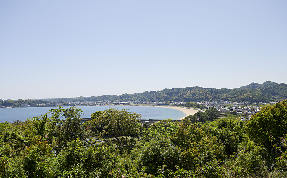 A lobby dining area with a splendid view, offering a panoramic vista of Blue Beach Nachi through large windows.